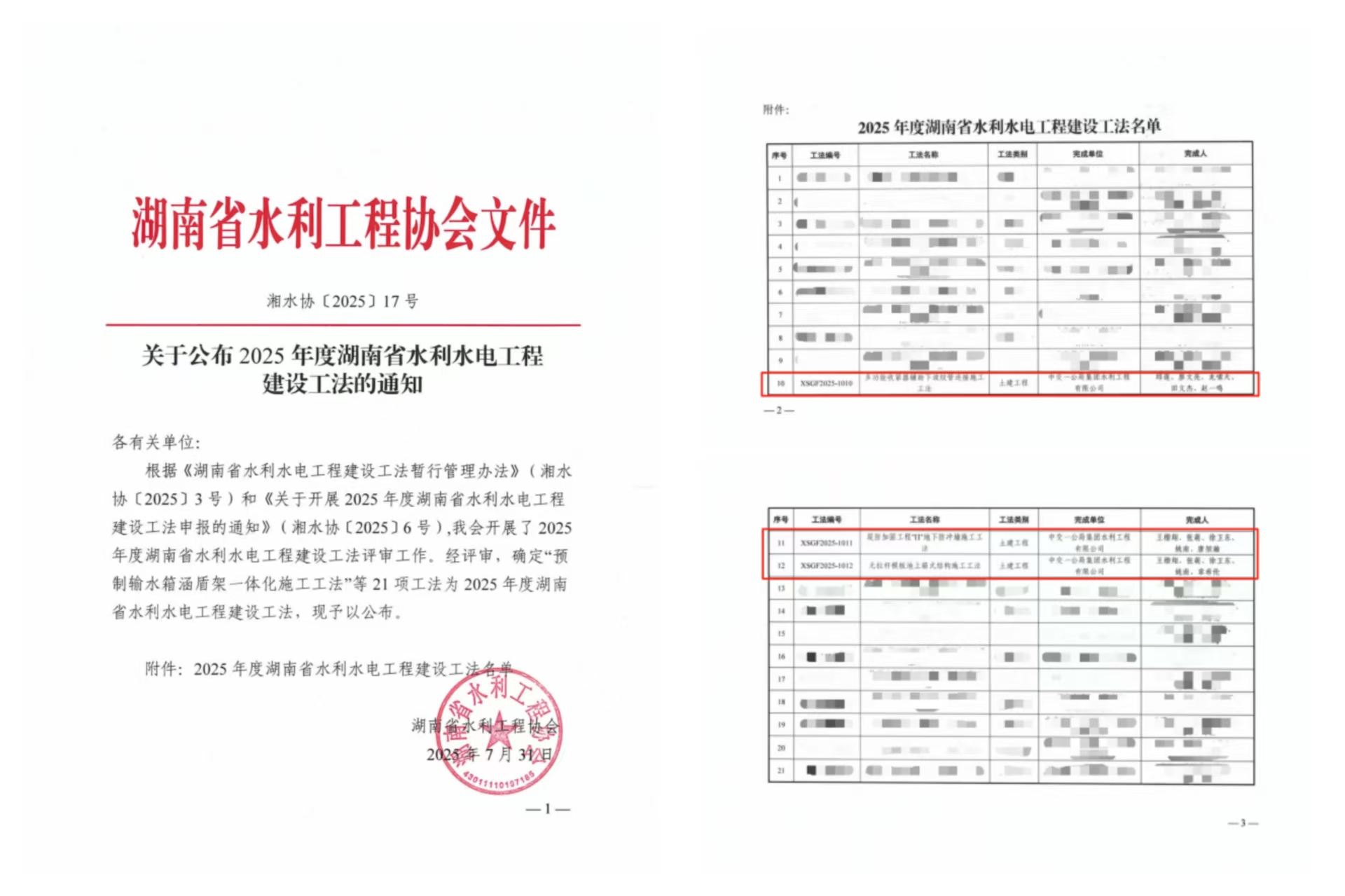 7月31日,湖南省水利工程协会发布《关于公布2025年度湖南省水利水电工程建设工法的通知》,公司三篇工法被评为“2025年度湖南省水利水电工程建设工法”。