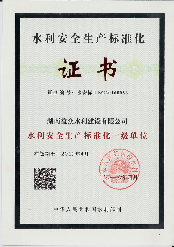 我公司荣获水利安全生产标准化一级单位