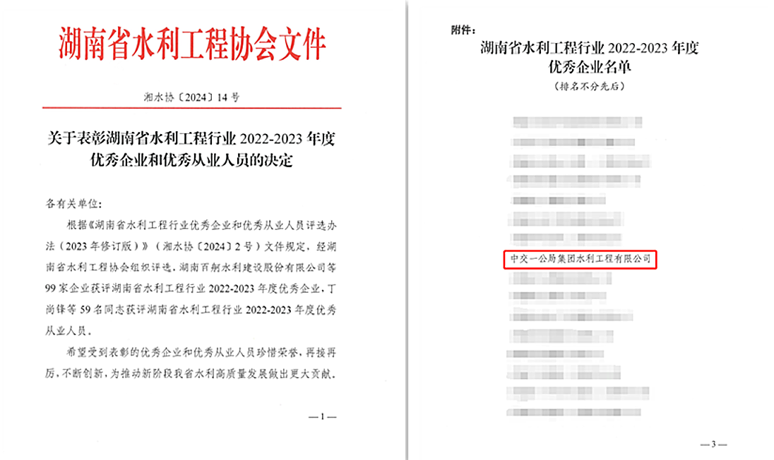 近日,在湖南省水利工程协会组织开展的湖南省水利工程行业2022-2023年优秀企业评选评价工作中,公司荣获“湖南省水利工程行业2022-2023年度优秀企业”荣誉称号,这是公司第二次获得此项殊荣。