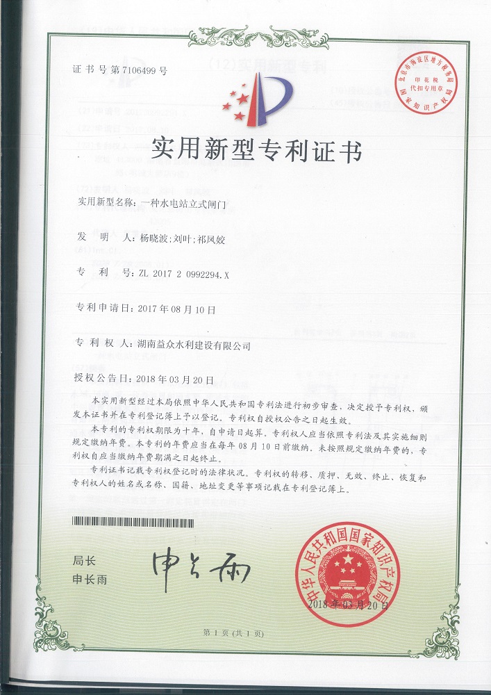 本实用新型提供一种水电站立式闸门,包括水坝、顶座、第一收卷装置和通水渠,所述水坝的中间设置有通水渠,所述闸门槽的内壁上均设置有滑槽,所述通水渠内的底部设置有底槽,所述通水渠中安装有闸门,所述凸棱活动安装在滑槽中,所述闸门的两端头均设置有滚轮,所述顶座的上方左侧设置有第一滑轮,所述顶座的上方左侧还设置有第一收卷装置,所述第一收卷装置与闸门通过第一钢索穿过第一通孔固定相连,所述第一钢索的底部通过第一固定装置固定在闸门的顶部左端,。本实用新型通过凸棱和滑槽的设置,使得闸门能与闸门槽能够密封连接,避免造成漏水,通过第一收卷装置和第二收卷装置的设置,使得闸门能够进行竖直提升。