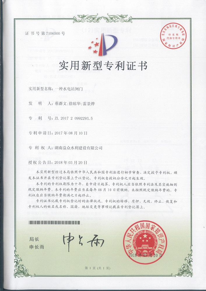 本实用新型提供一种水电站闸门,包括水坝基体、支撑柱、闸板、启闭机和摄像装置,所述闸门主体的底部设置有水坝基体,所述水坝基体的底部设置有下部垫料层,所述水坝基体的中间设置有上部垫料层,所述水坝基体的顶部设置有坡面防渗漏层,所述水坝基体的顶部左右两侧设置有支撑柱,所述支撑柱的顶端设置有支撑板,所述支撑板的顶部左侧设置有控制器,所述支撑板的顶部中间设置有连接孔,所述支撑柱的内侧设置有闸门夹板,所述闸门夹板的前侧壁上设置有水位感应器。本实用新型的底部设置有水坝基体,使得闸门与水坝连为一体,然后实现控制水流的效果,其中闸板可以在滑槽内进行上下运动。