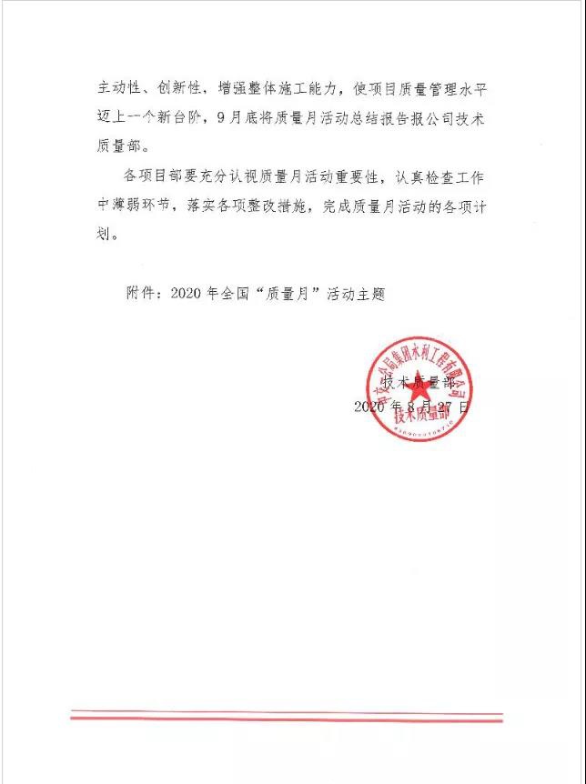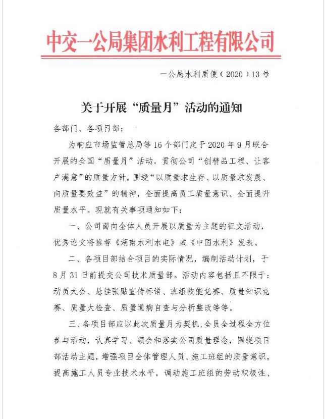 2020年9月是全国第43个质量月,为响应国家质量月活动,贯彻公司“创精品工程、让客户满意”的质量方针,提升公司及各项目部质量管理水平,水利公司下发了《关于开展“质量月”活动的通知》,要求公司各项目部认真开展质量月活动。