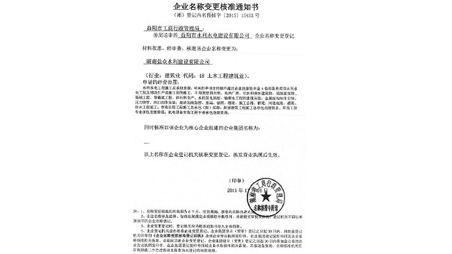 2016年3月,我公司正式更名为湖南益众水利建设有限公司,公司网址变更为:www.hnyzsj.cn ,公司地址、联系方式等不发生变化。